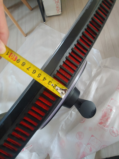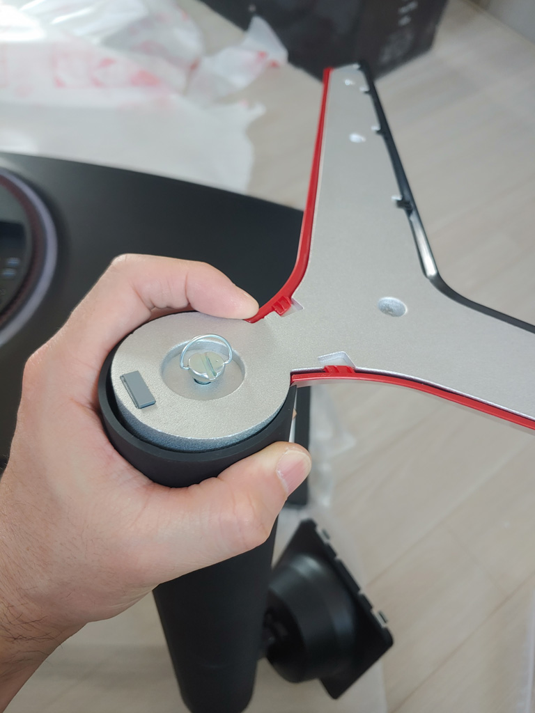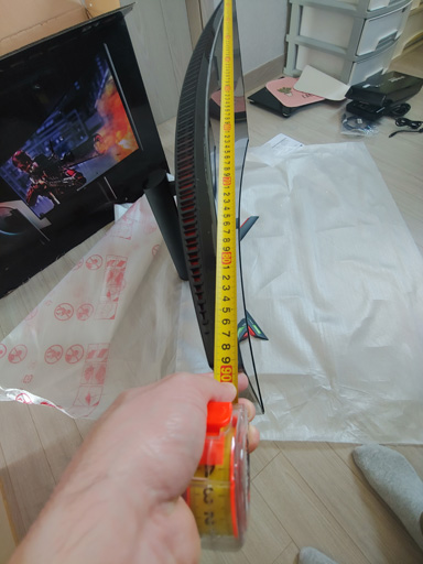포장지를 벗기고 모니터 받침대와 틸트봉을 고정시키고 줄자로 크기를 가늠해 봅니다.