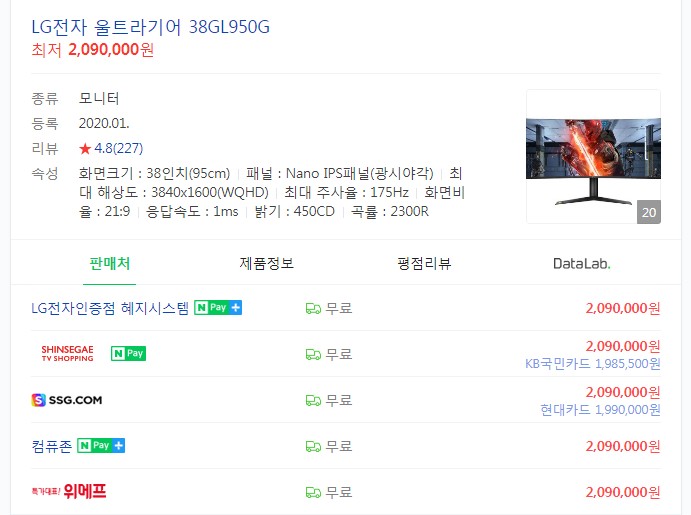 LG 38GL950G 울트라기어보다 성능이 조금 떨어지지만 가격은 저가격의 반값에 구매 가능한 가성비 좋은 모니터들이 있으시니 잘 검색해 보시고 선택하시길 바랍니다.