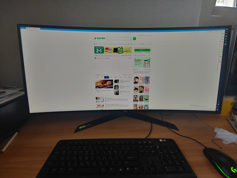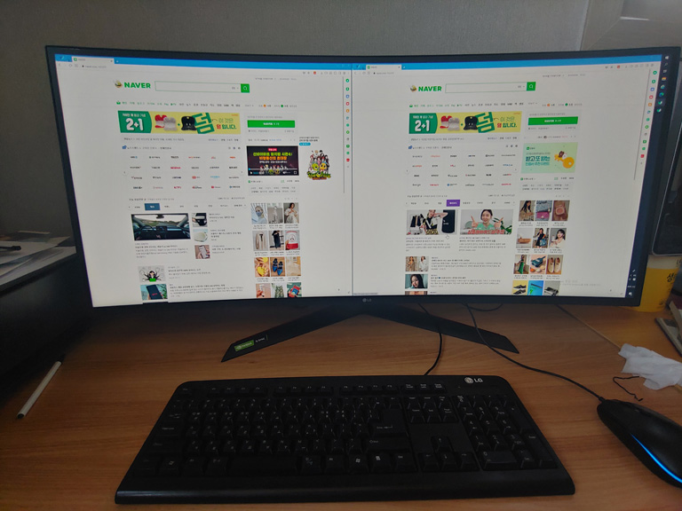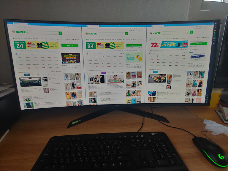 넓이 1200짜리 책상 위에 올려놓으니 모니터 한대만 올려놓으면 옆에 다른 걸 올릴 수가 없네요 ㅎㅎ 모니터가 정말 커서 웹 브라우저를 3개 띄워놓고 써도 될 정도입니다. 주식 창 띄워 놓으면 끝내주겠네요 ㅎㅎ