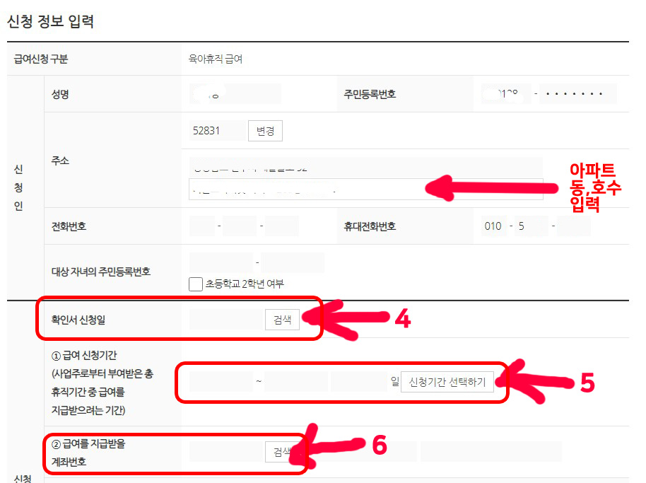 이름, 주민번호, 연락처는 기본적으로 등록이 되어 있고요, 주소는 아파트, 동, 호수는 입력하게 되어 있네요.