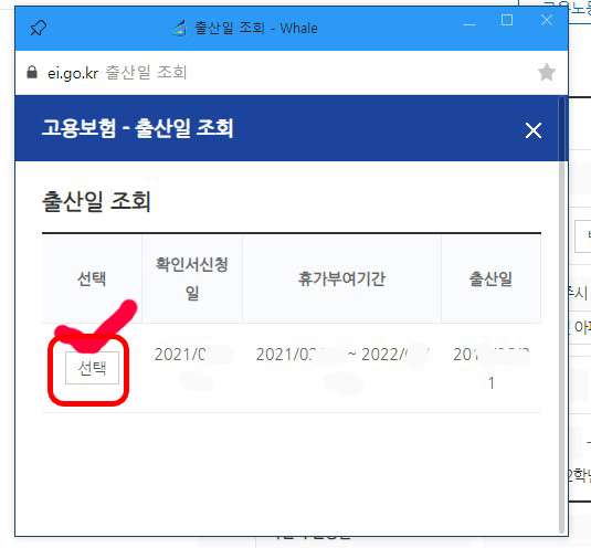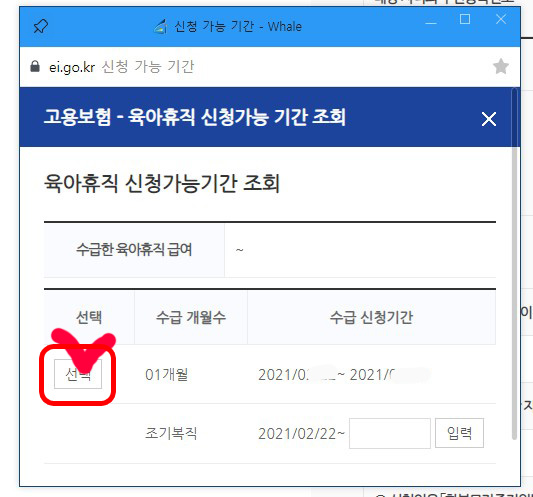 팝업창에서 수급 신청 기간을 선택하시면 팝업창이 닫히면서 입력이 됩니다.