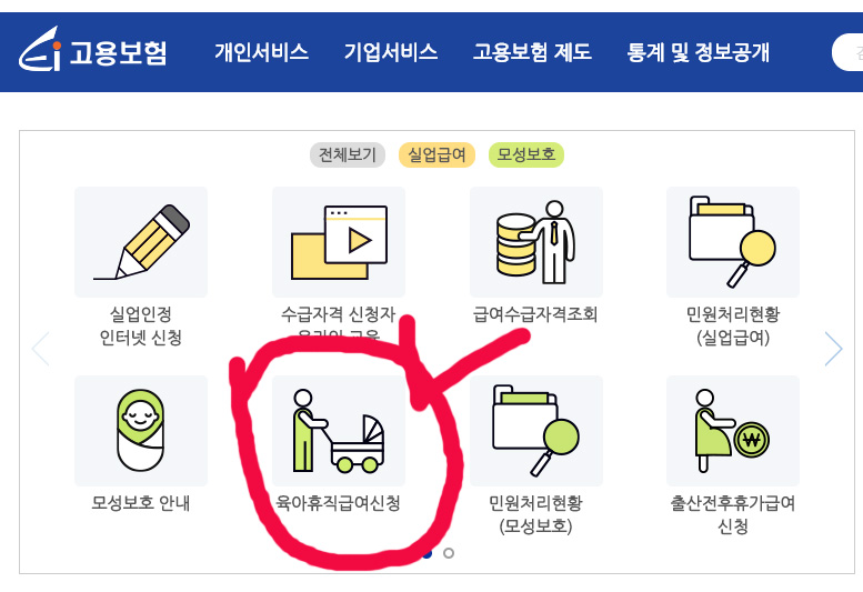 2. 로그인이 되었으면 아래처럼 육아휴직 급여 신청 클릭