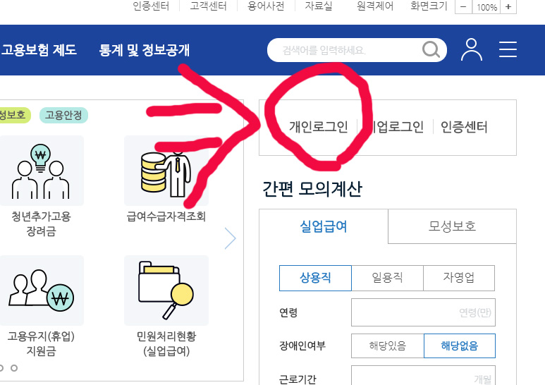 1. 고용노동부 홈페이지에 들어가서 로그인을 합니다.