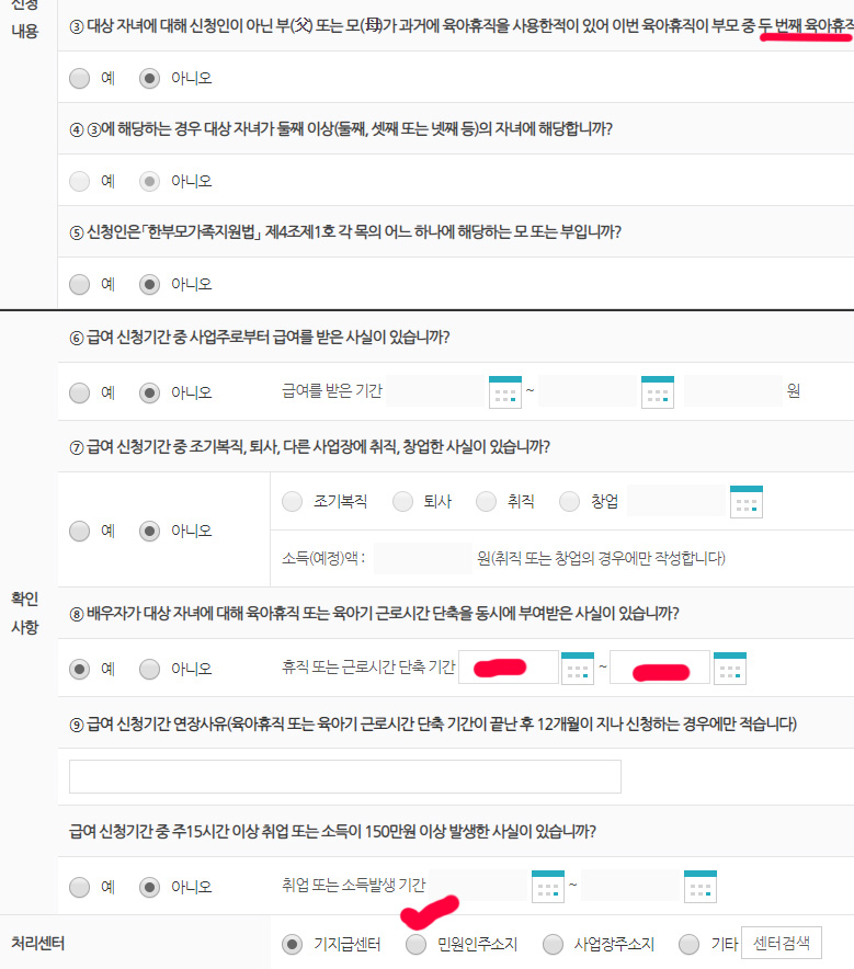 저 같은 경우 부부 동시 휴직이라 8항에 배우자의 육아휴직 기간을 입력하였고, 처리 센터 선택란이 있는데 저는 주민등록상의 주소인 민원인의 주소지를 선택해서 제출하니 이틀 정도 지나서 계좌로 입금 받았습니다.