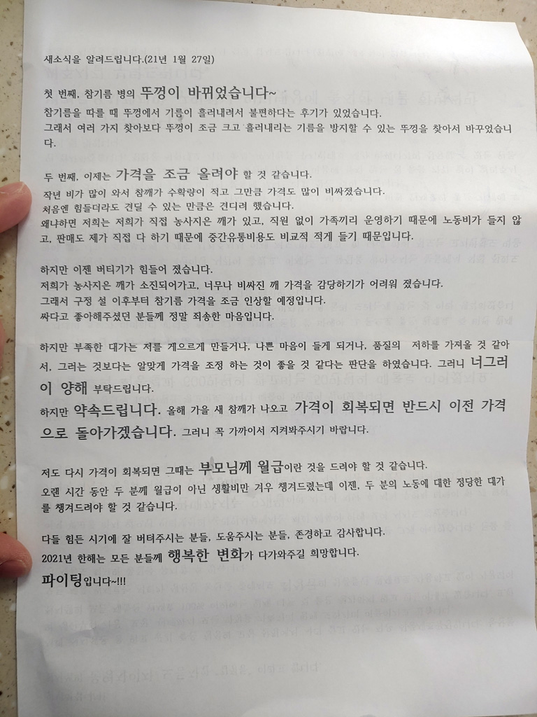 부모님이 농사를 하셨어 시골에 갔다 올 때면 어김없이 참기름 한 병을 꼭 주세요.