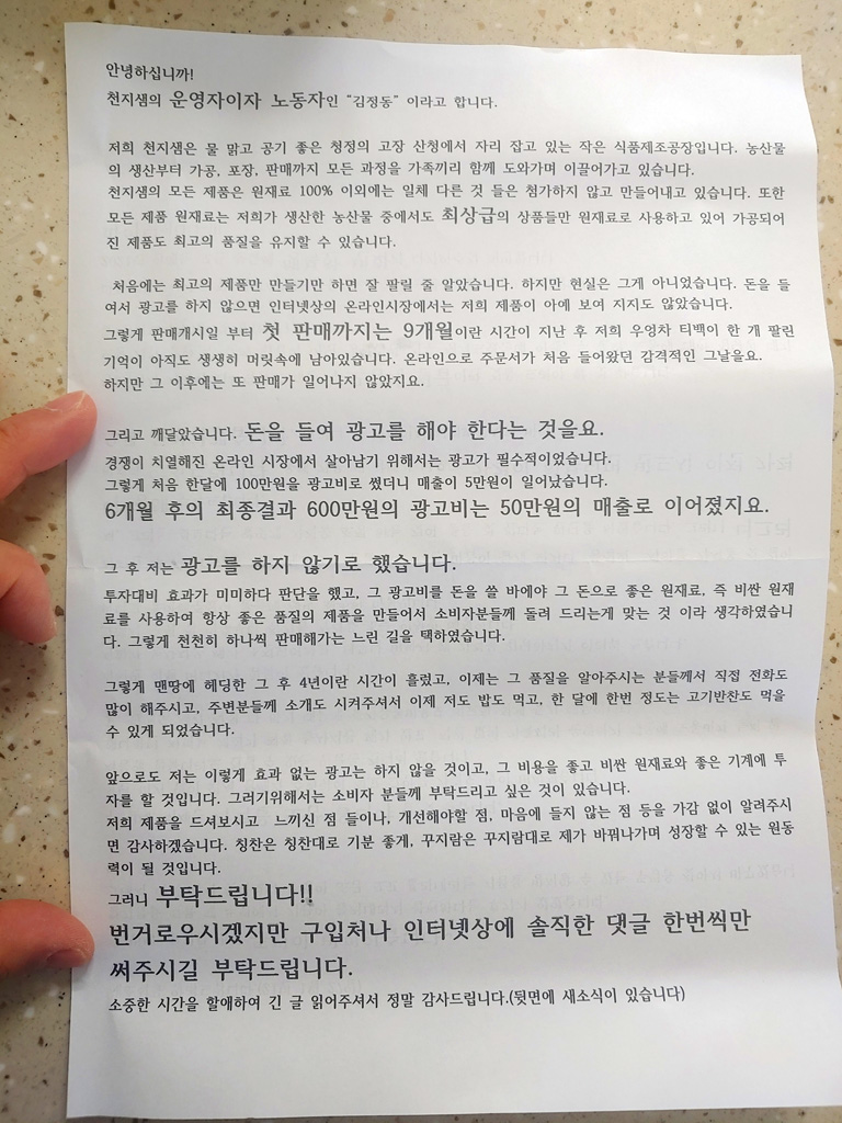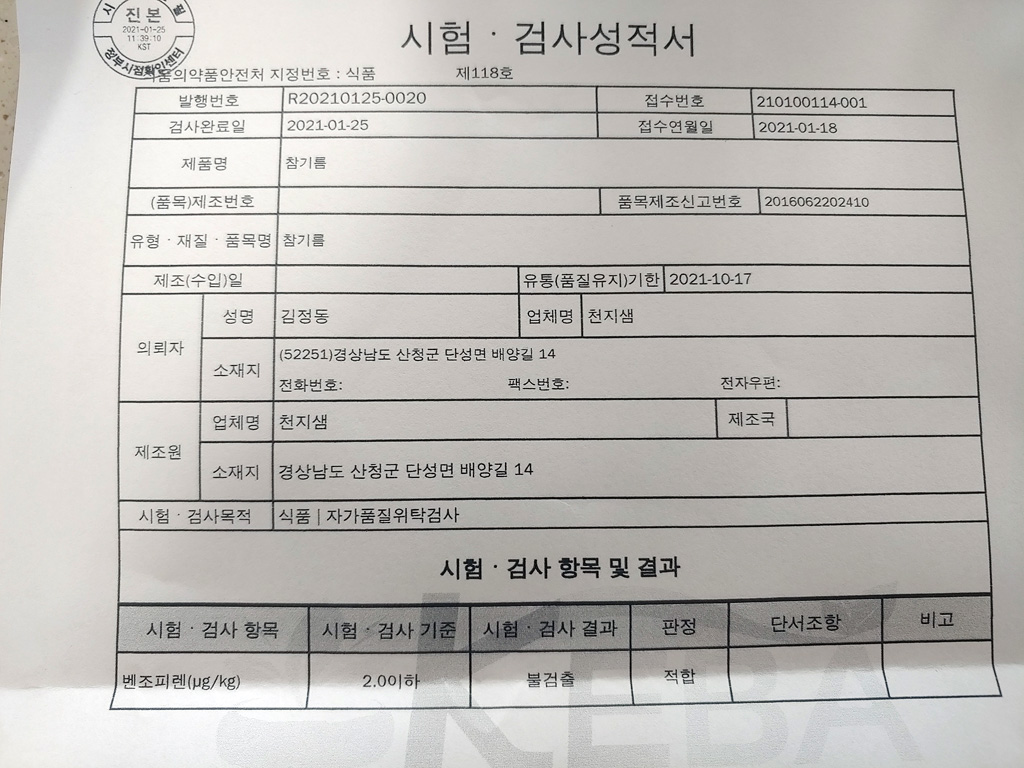 참기름을 택배로 받으면 같이 시험 검사서를 복사해서 같이 넣어주세요.
